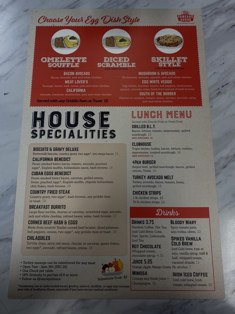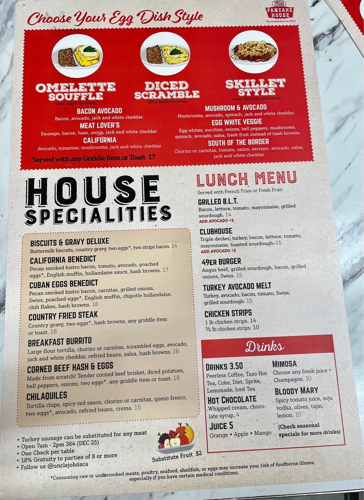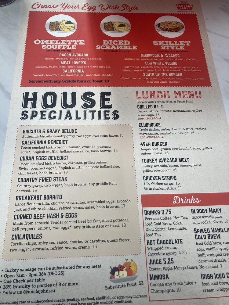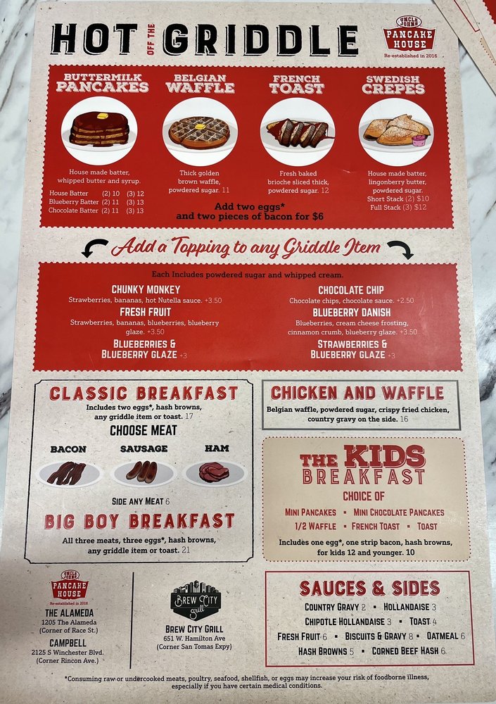 Uncle John’s Pancake House in Winchester is a must-visit for breakfast and brunch lovers. Offering a variety of options including omelettes, scrambles, pancakes, and classic breakfast dishes, this restaurant prides itself on its diverse menu. With vegan and vegetarian options available, as well as accommodations for those with specific dietary needs, Uncle John’s Pancake House is inclusive and welcoming to all. The restaurant's location in Campbell, CA makes it convenient for locals and visitors alike to enjoy a delicious meal. The cozy atmosphere, friendly staff, and extensive menu make this spot a perfect choice for any meal of the day. Don't miss out on the opportunity to try their mouth-watering dishes like the Bacon Avocado omelette or the Short Stack Buttermilk pancakes. dine-in, takeout, and delivery options are all available, so you can enjoy Uncle John’s Pancake House wherever you are.